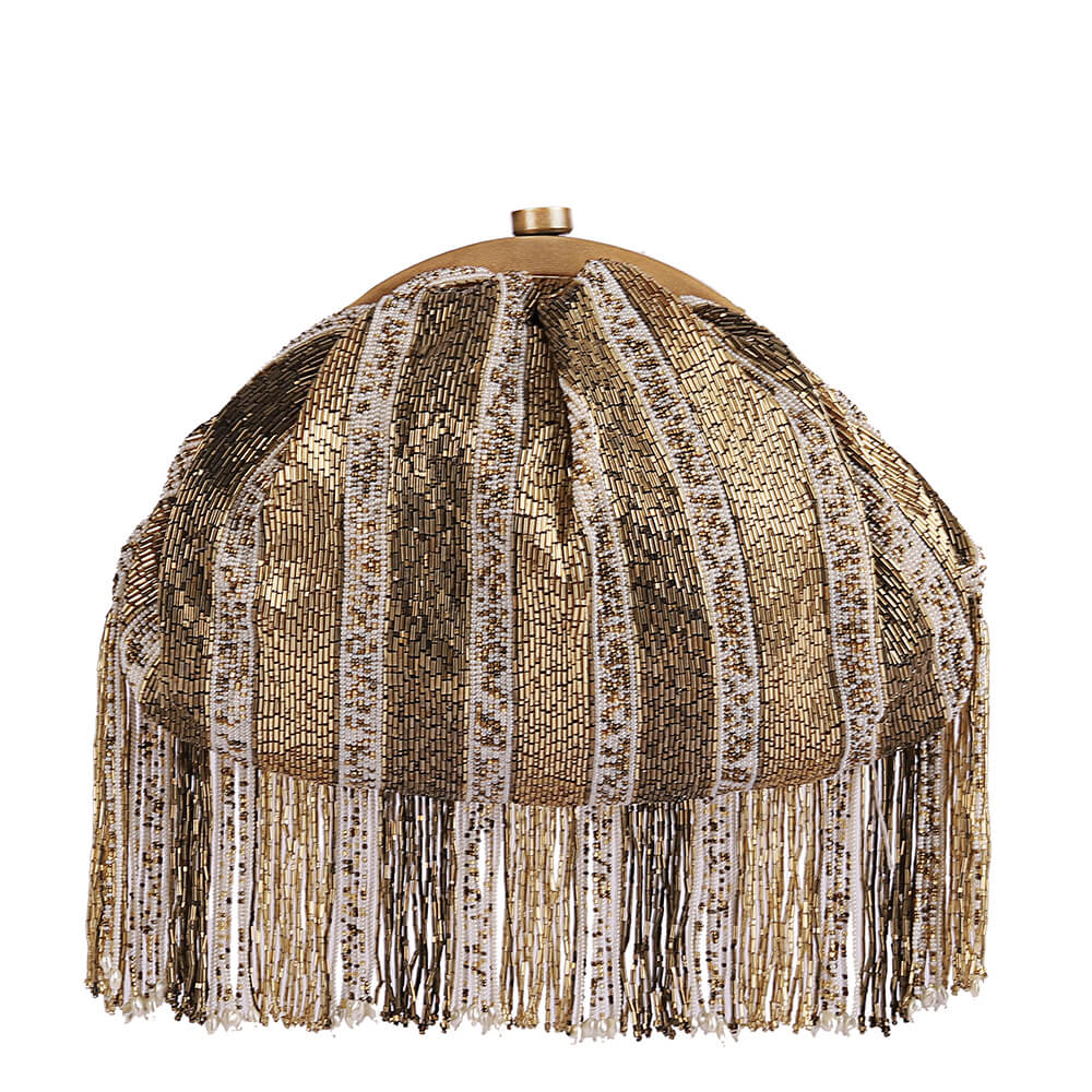 This eclectic soft pouch is sumptuously hand embroidered with luminous Japanese micro beads, glass crystals & baroque pearls. Inspired by heritage Kashmiri Kanikar shawls, Indian North eastern stripe weaves & French Pashmina design this is a timeless piece . This pouch can be used from either side as an archival paisley design adorns the front while nonchalant embellished stripes dress the back. It has handmade zardosi striped tassels.