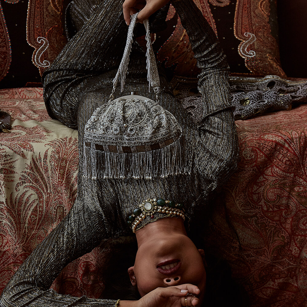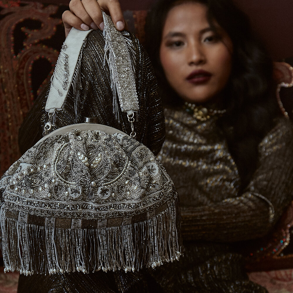 This eclectic soft pouch is sumptuously hand embroidered with luminous Japanese micro beads , glass crystals & baroque pearls. Inspired by heritage Kashmiri kanikar shawls, Indian North Eastern stripe weaves & French pashmina designs, this is a timeless piece . This pouch can be used from either side as an archival paisley design adorns the front while nonchalant embellished stripes dress the back. It has handmade zardosi striped tassels.