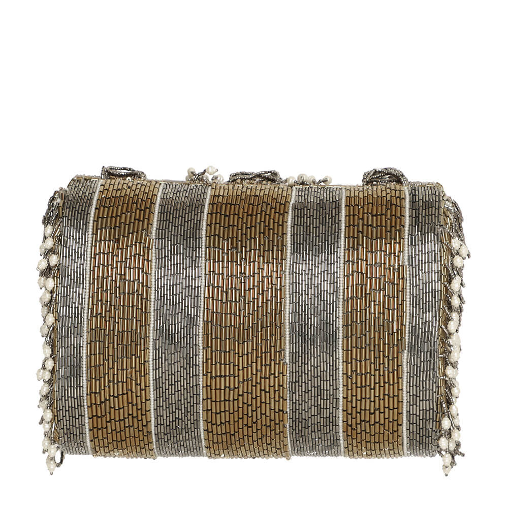 This lustrous flapover clutch is sumptuously hand embroidered with luminous Japanese micro beads & baroque pearls in a pave’ application. Ornamental scallop tassels & wisply baroque fringes adorn the front while nonchalant stripes dress the reverse side of this clutch. It has a suedette lining & long chain handle.