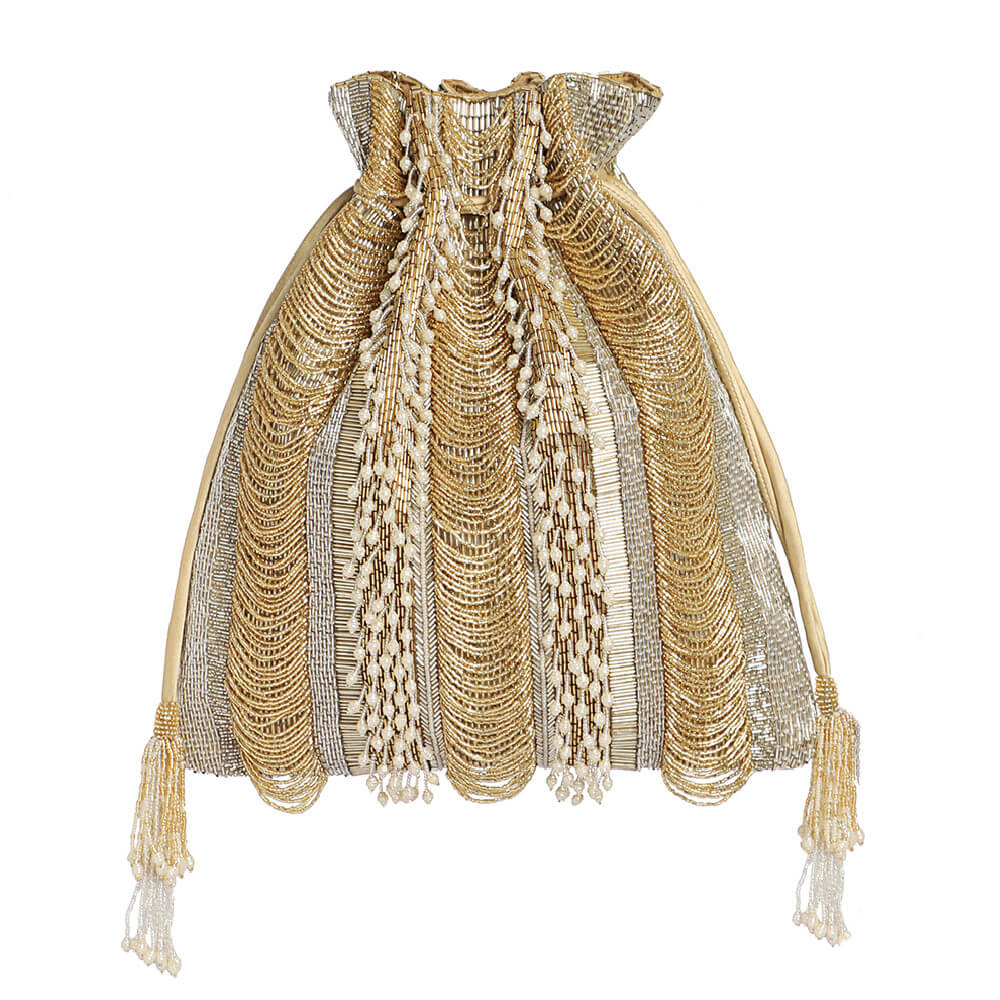 This lustrous drawstring pouch can be styled as a sling bag and a potli. It is sumptuously hand embroidered with luminous Japanese micro beads & baroque pearls in a pave’ application. Ornamental scallop tassels & wisply baroque fringes adorn the front while nonchalant stripes dress the reverse side of this pouch. It has a suedette lining ,long detachable chain handle, wristlet handles and intricate handbeaded tassels . STYLE TIP : The contemporary aesthetic & versatility of this pouch is enhanced when paired with a detachable statement handle, It allows a seamless switch to a unique new look for the same pouch, while depicting an individualistic personal style.