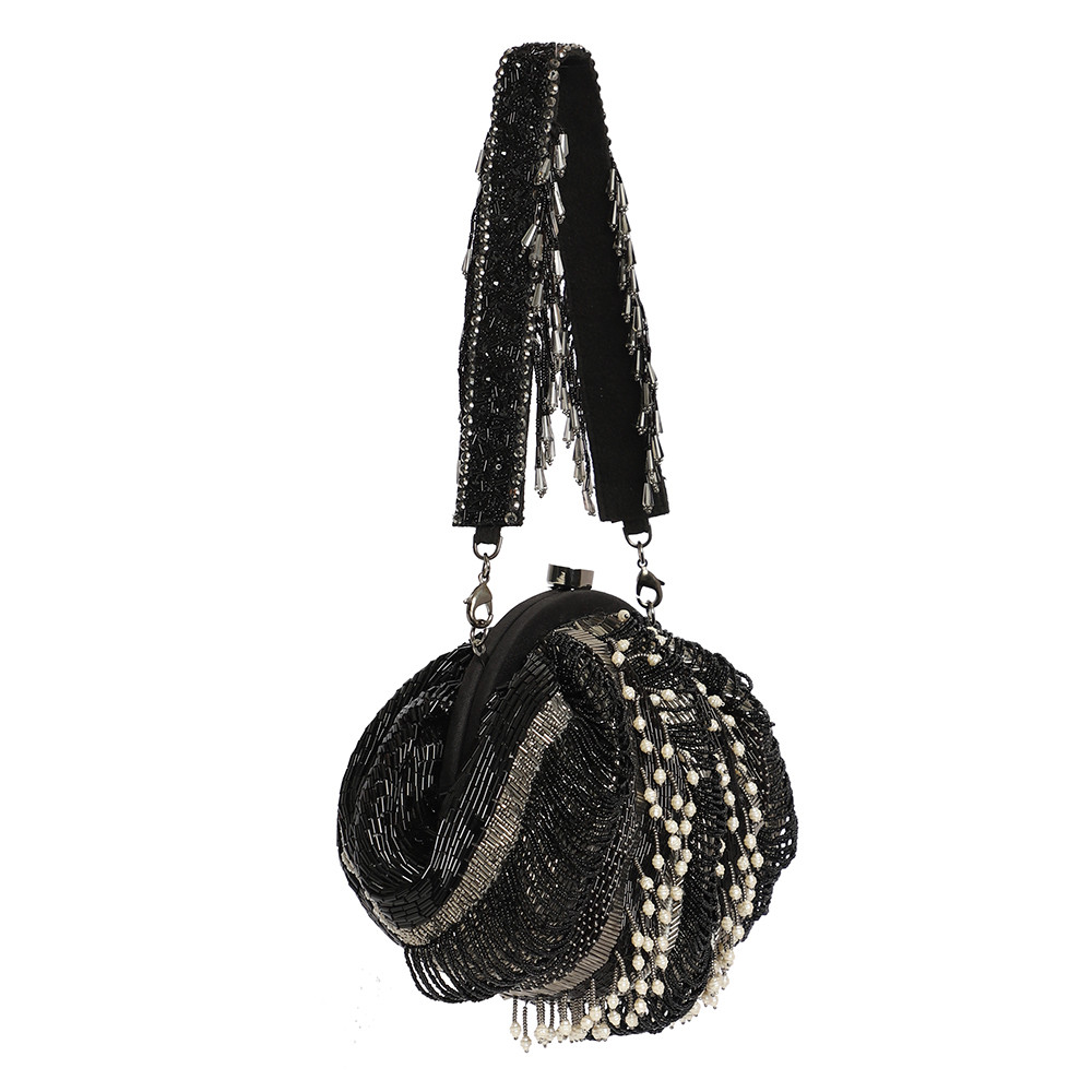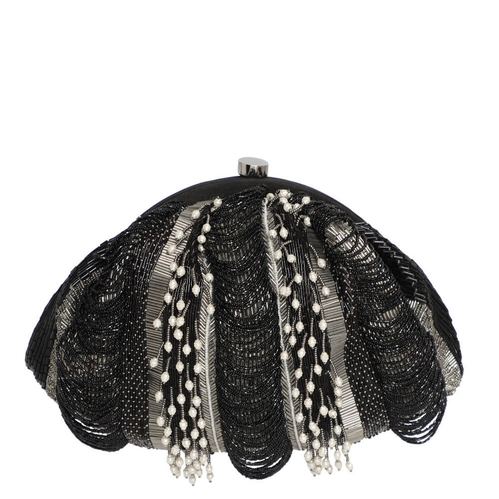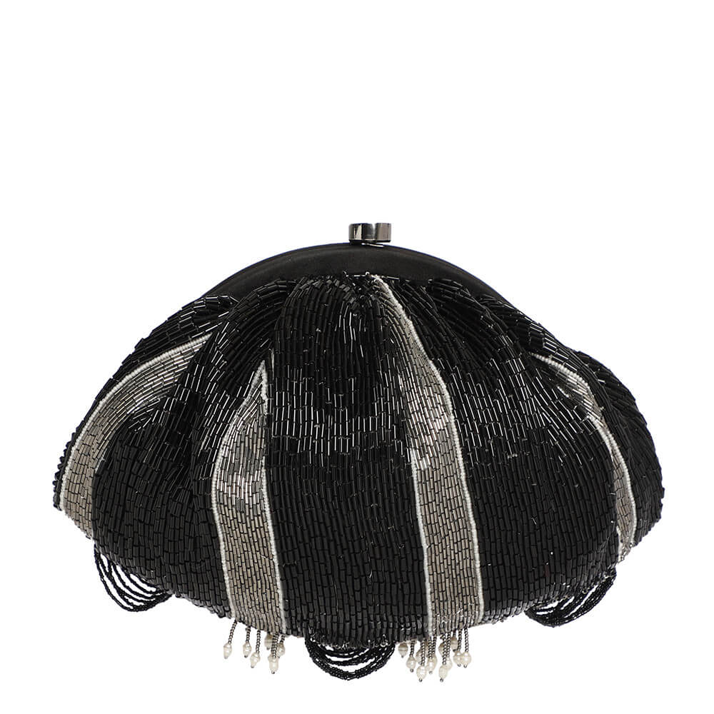 This lustrous soft frame pochette is sumptuously hand embroidered with luminous Japanese micro beads & baroque pearls in a pave’ application. Ornamental scallop tassels & wisply baroque fringes adorn the front while nonchalant stripes dress the reverse side of this pouch.