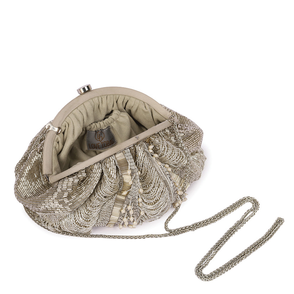 This lustrous soft frame pochette is sumptuously hand embroidered with luminous Japanese micro beads & baroque pearls in a pave’ application. Ornamental scallop tassels & wisply baroque fringes adorn the front while nonchalant stripes dress the reverse side of this pouch.