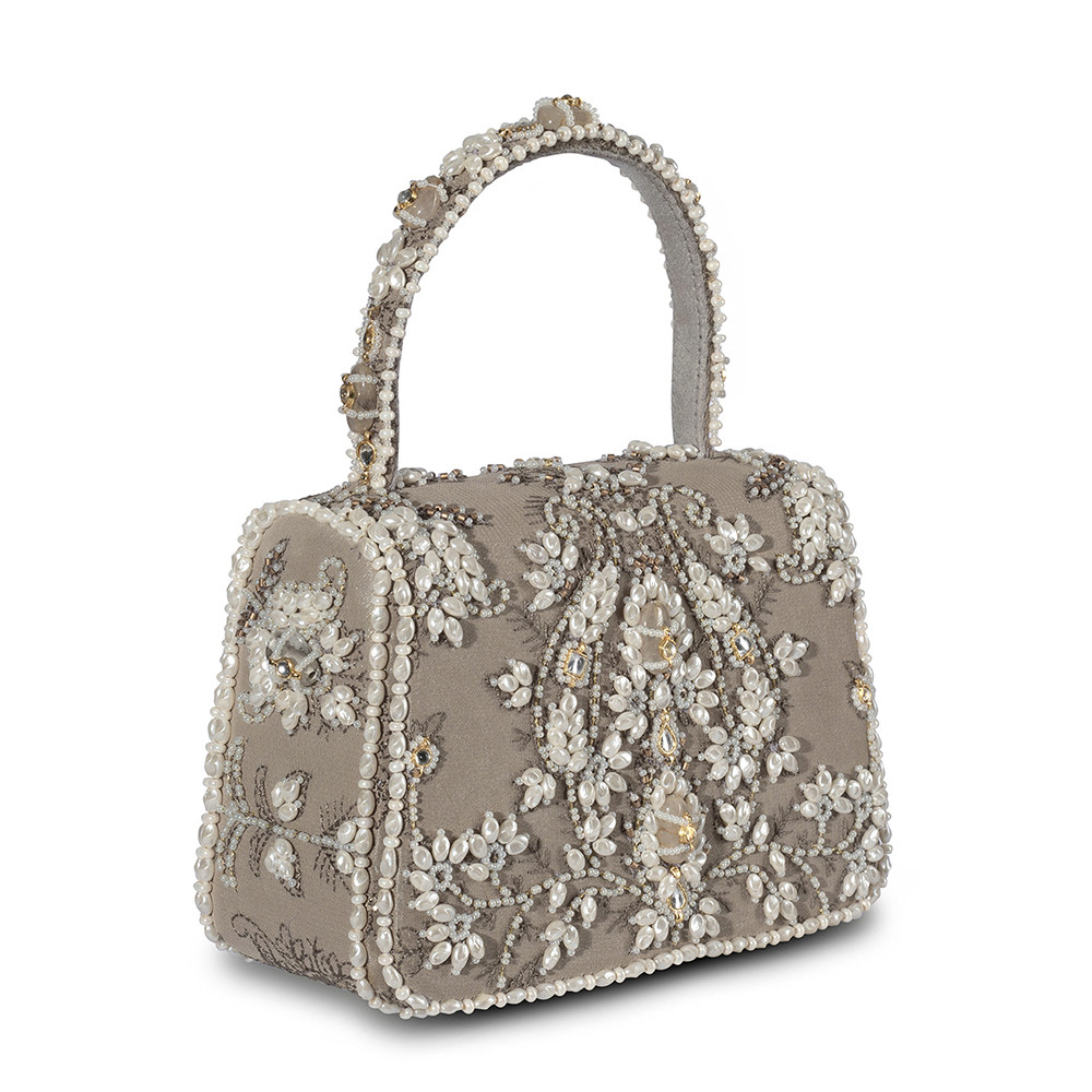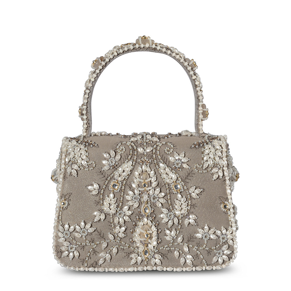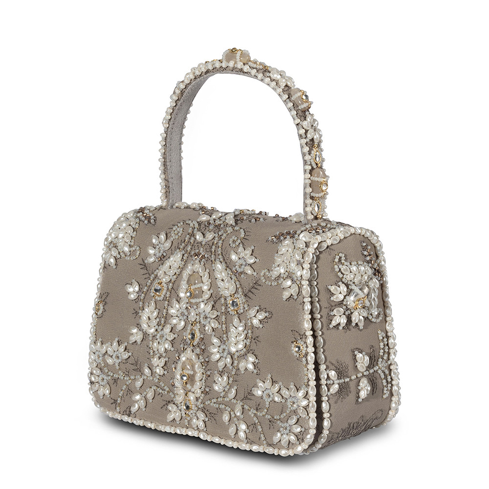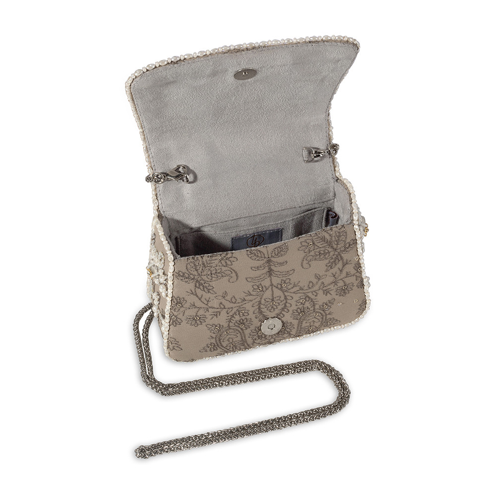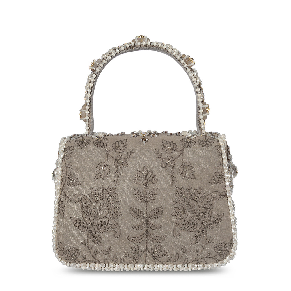 The Sia Mini Trapezium in Grey draws inspiration from the rare beauty of South Sea pearls, with designs that echo the elegance of Jaipuri polki jewelry. Its pearlesque, natural tone offers a subtle and refined aesthetic. Crafted on a georgette base, it blends the delicate Katha technique with the timeless elegance of Jadau jewelry. It’s compact, structured shape adds a bold, modern edge, while the embellished top handle and a crossbody chain provide versatile styling options. Perfect for holding makeup, currency, cards and keys, and includes an inside slip pocket for easy organization.