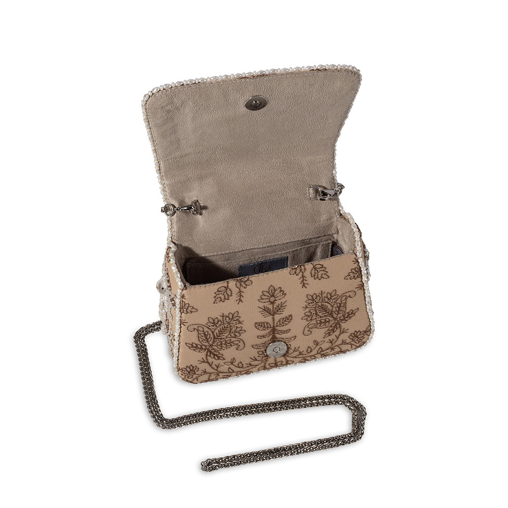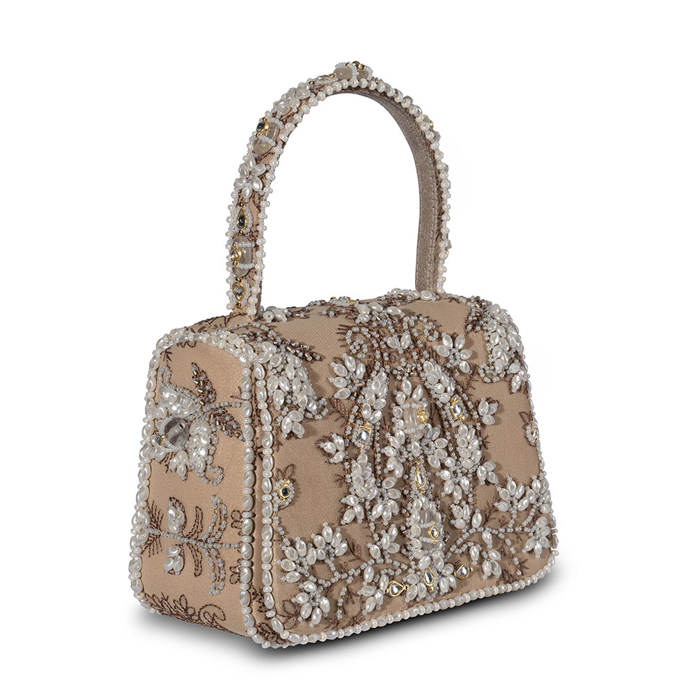 The Sia Mini Trapezium in Nude draws inspiration from the rare beauty of South Sea pearls, with designs that echo the elegance of Jaipuri polki jewelry. Its pearlesque, natural tone offers a subtle and refined aesthetic. Crafted on a georgette base, it blends the delicate Katha technique with the timeless elegance of Jadau jewelry. It’s compact, structured shape adds a bold, modern edge, while the embellished top handle and a crossbody chain provide versatile styling options. Perfect for holding makeup, currency, cards and keys, and includes an inside slip pocket for easy organization.