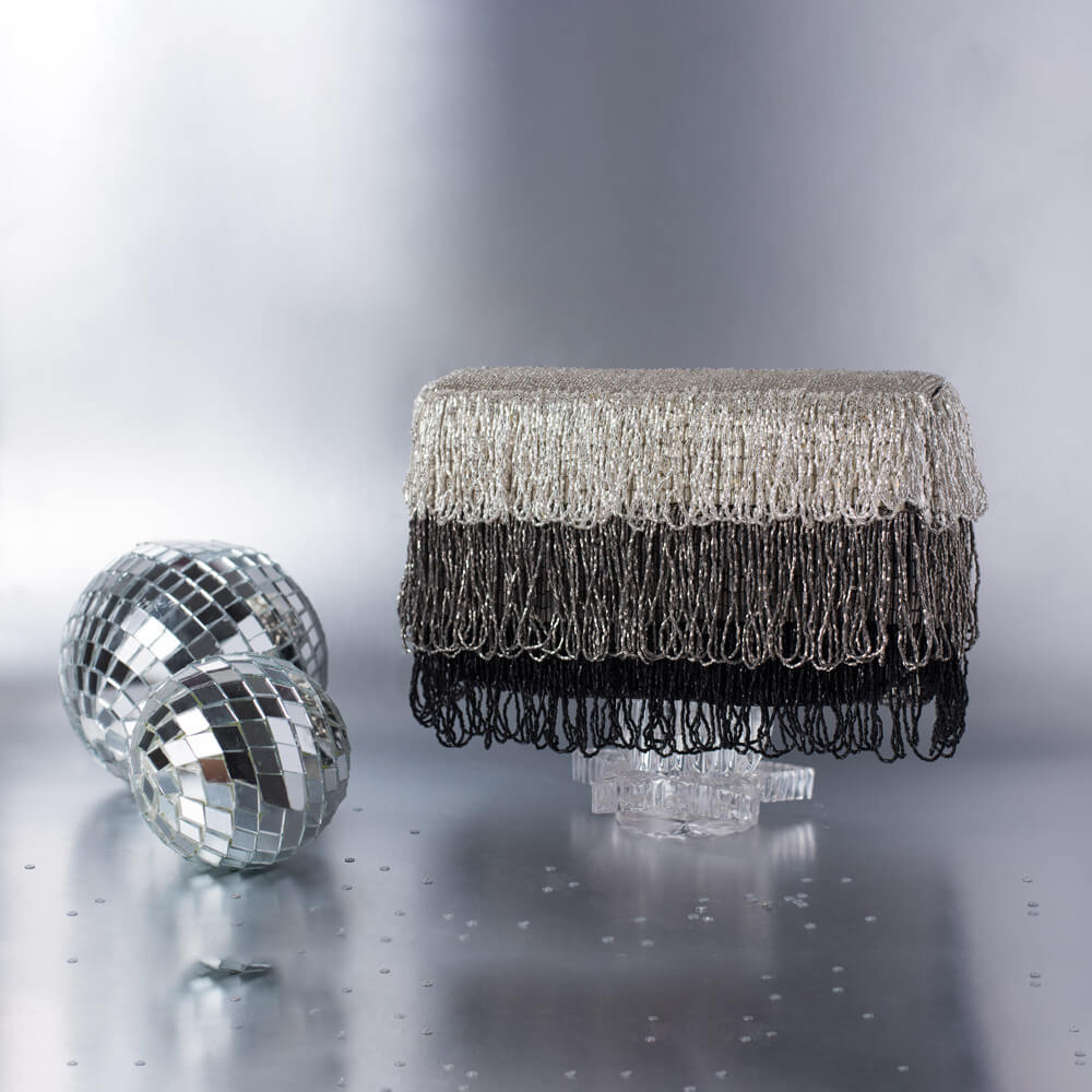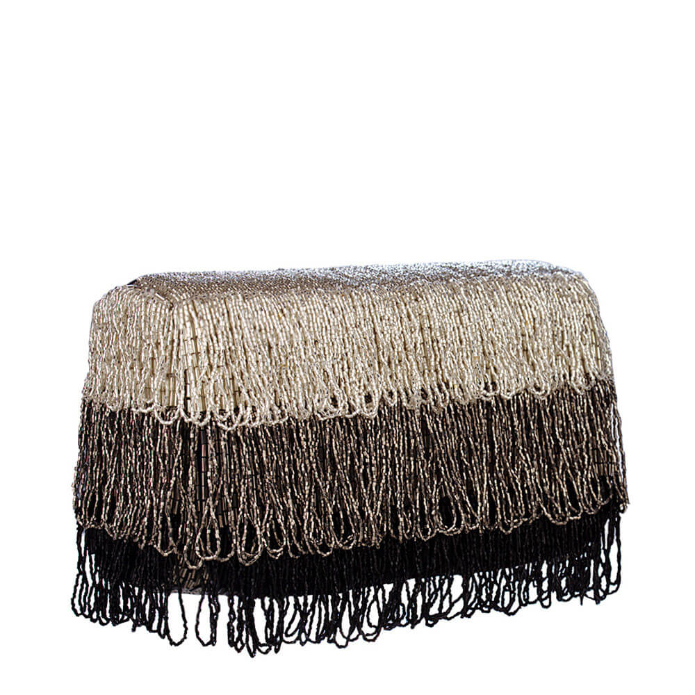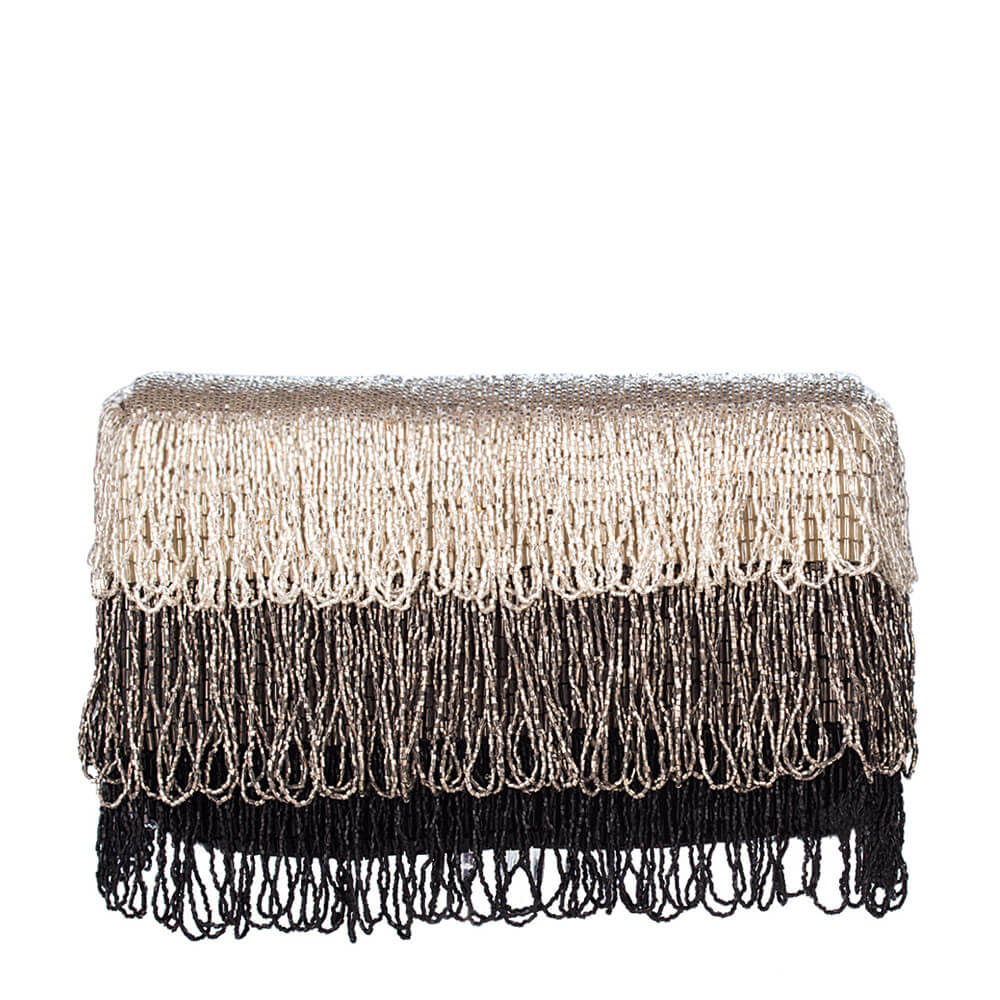This tiered tassel flapover clutch is delicately hand embroidered with fine Japanese beads.