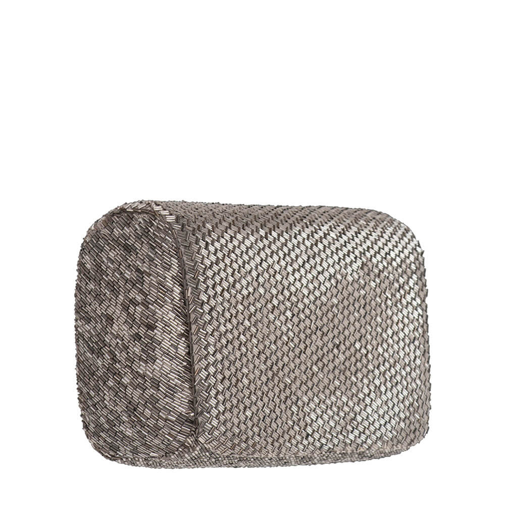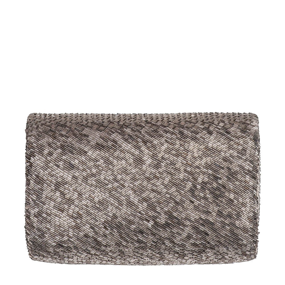 This flapover clutch is intricately hand embroidered with fine Japanese bugle beads in an entwining pattern like that of a basket – holding a bunch of flowers in bloom.
