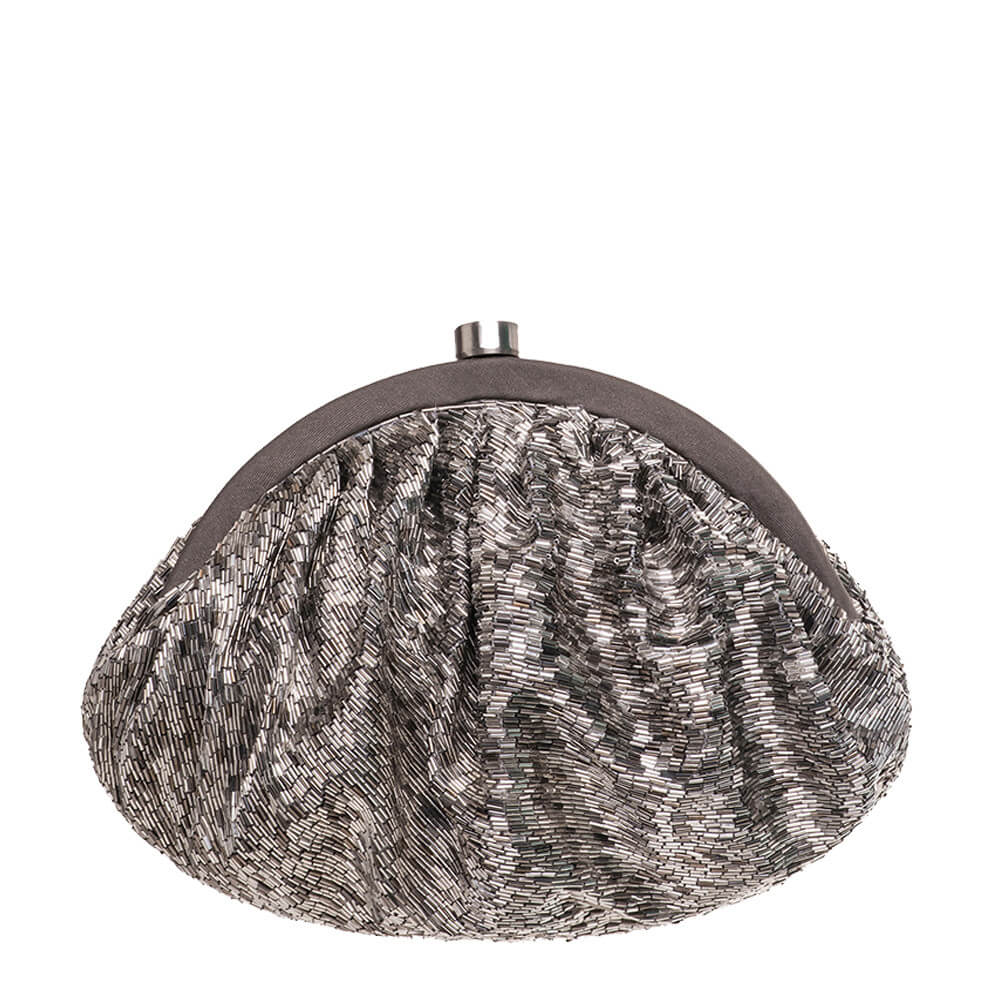 This pouch is intricately hand embroidered with fine Japanese bugle beads in an entwining pattern like that of a basket – holding a bunch of flowers in bloom.