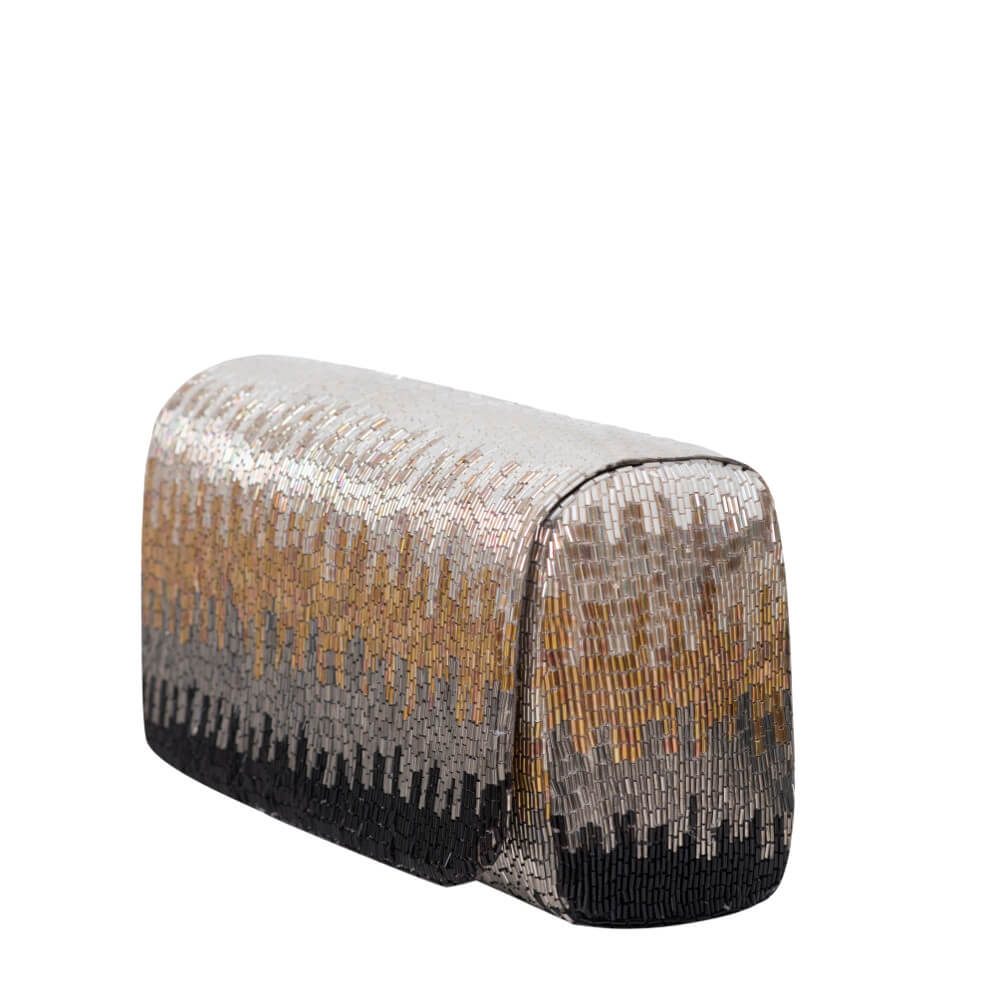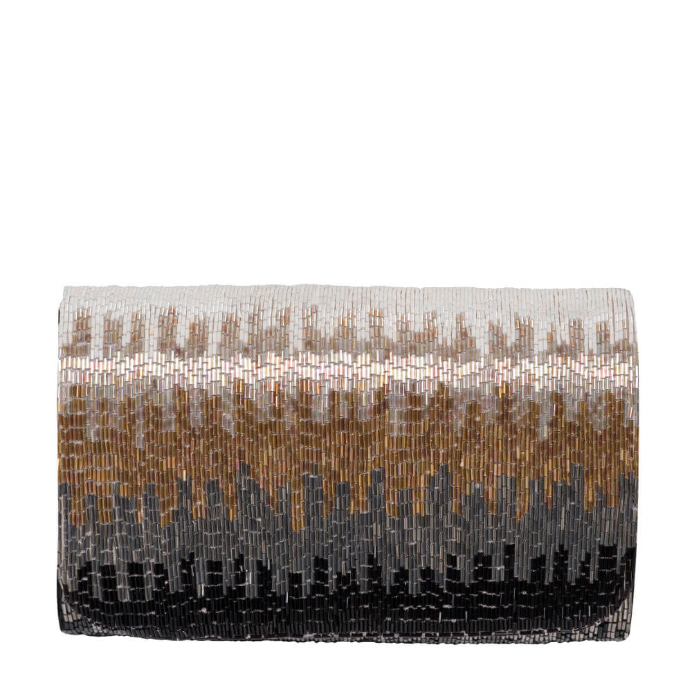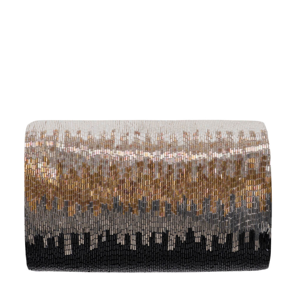 This elegant flapover clutch is delicately hand embroidered with fine japanese bugle beads. The design has an iredescent feel, transporting one to an awe inspiring world of fantasy. STYLE TIP: Carry with your blue denims, classic blouses, maxis, evening ensembles as well as traditional Indianwear for a chic look.