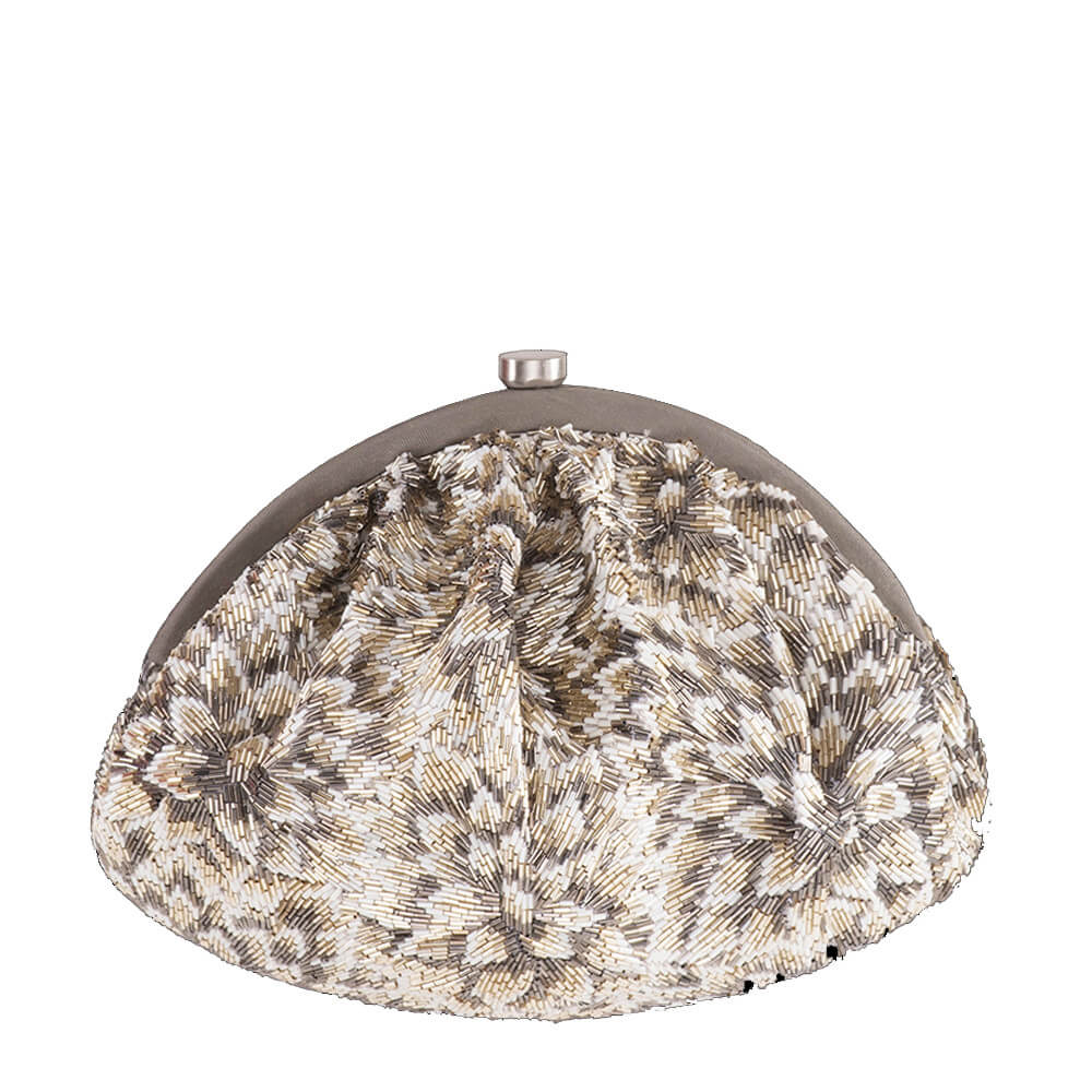 This pouch is intricately hand embroidered with fine Japanese bugle beads. The design reflects a bouquet of fresh daisies with an ombre’ effect.