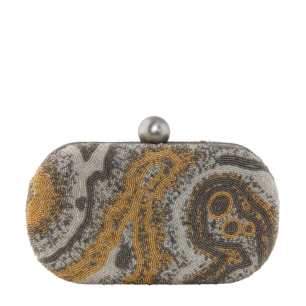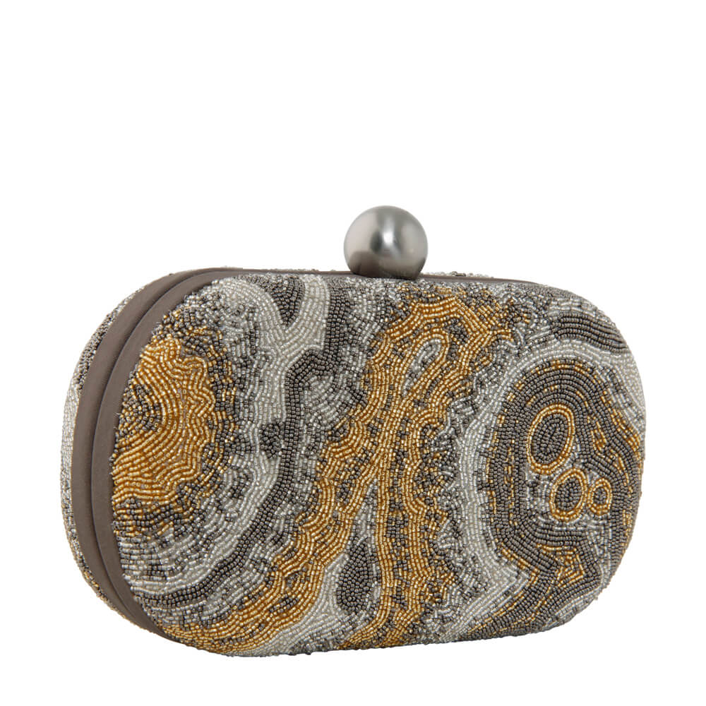 This timeless clutch is delicately hand embroidered with fine japanese beads. It has a suedette lining & long chain handle.The design has a pschyadelic feel, transporting one to an awe inspiring world of fantasy. STYLE TIP: Carry it with your blue denims, classic blouses, maxis, evening ensembles as well as traditional Indianwear for a classic modern look.