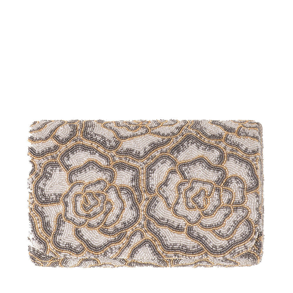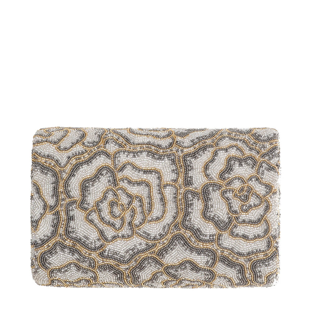 This flapover clutch is intricately hand embroidered with fine Japanese seed beads.The pattern reflects the exuberance of roses with an ombre’ effect.