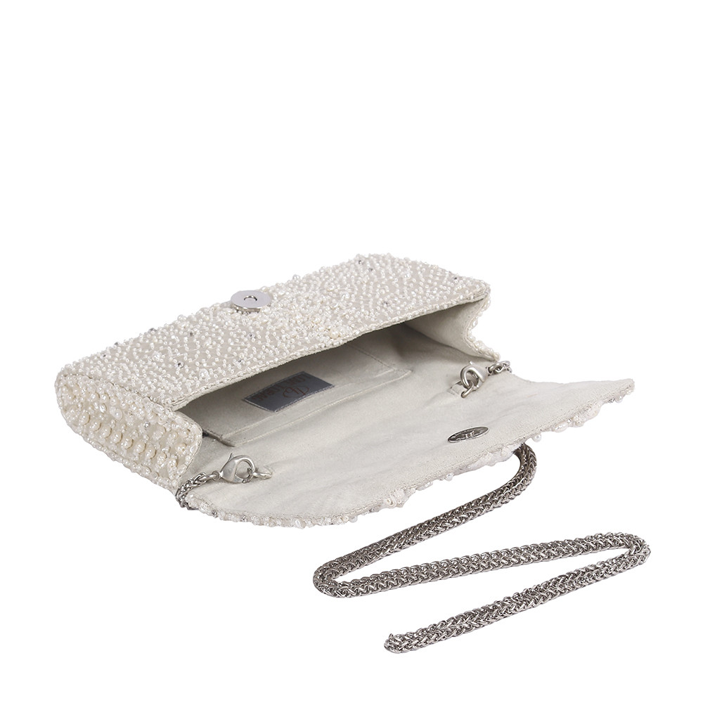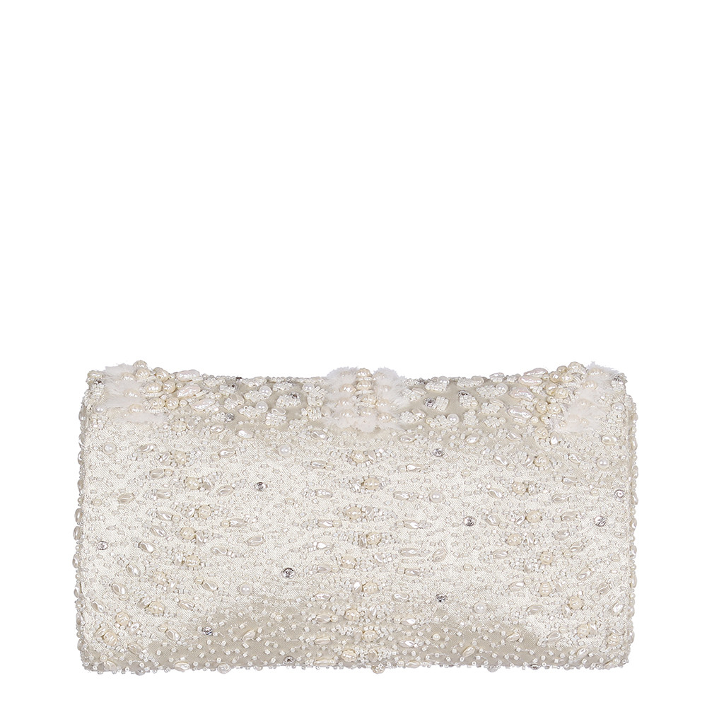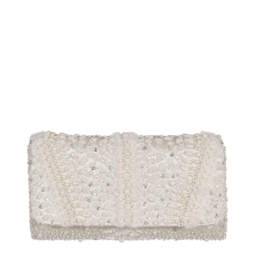 The ethereal design of Veira Chain Wallet Ivory has been decadently hand-embroidered inspired by the serpent skin texture. It is embellished with lustrous Japanese beads, freshwater baroque pearls, rhinestones and delicately manicured fur. This collectible statement accessory fits in your valuables like a smartphone, makeup, keys, currency and cards.