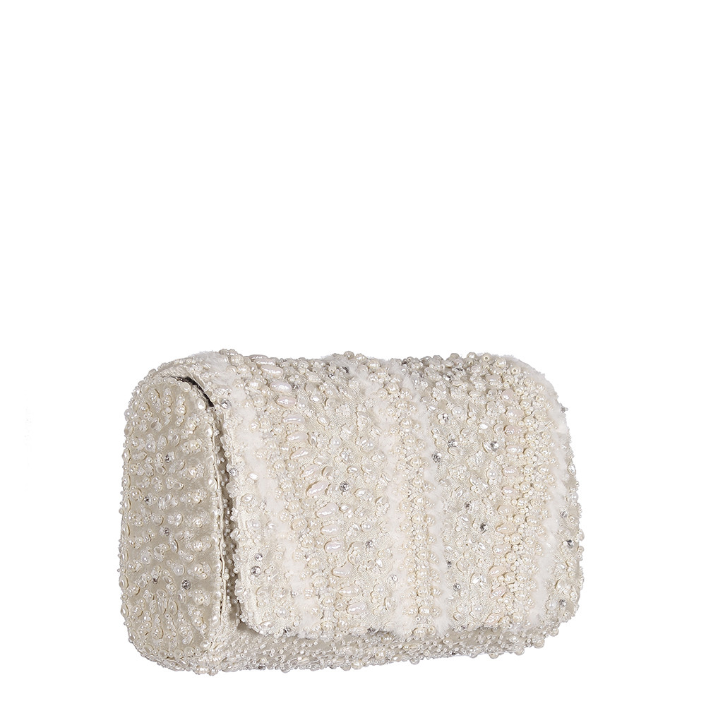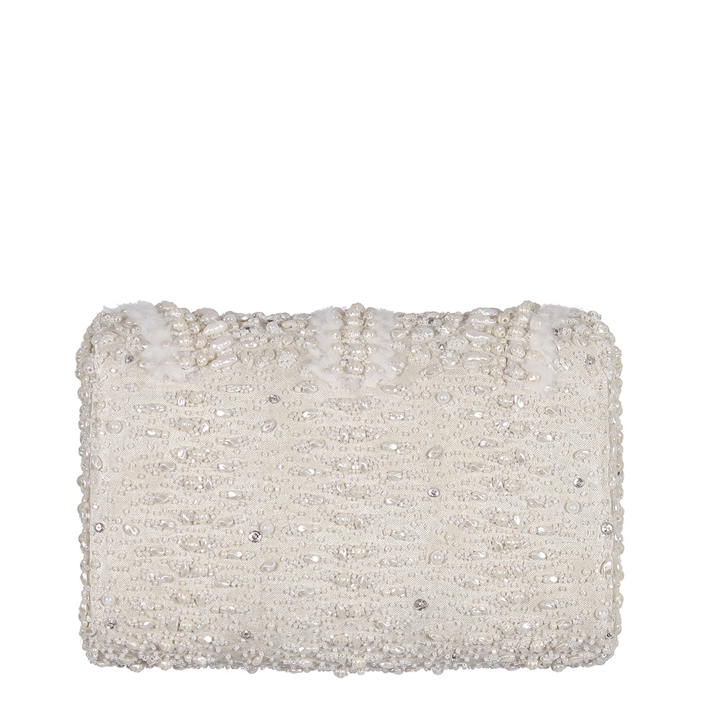 The ethereal design of Veira Flapover Clutch Ivory has been decadently hand-embroidered inspired by the serpent skin texture. It is embellished with lustrous Japanese beads, freshwater baroque pearls, rhinestones and delicately manicured fur. This collectible statement accessory fits in your valuables like a smartphone, makeup, keys, currency and cards.