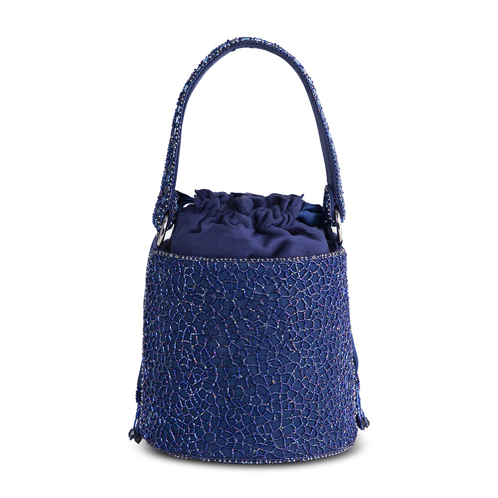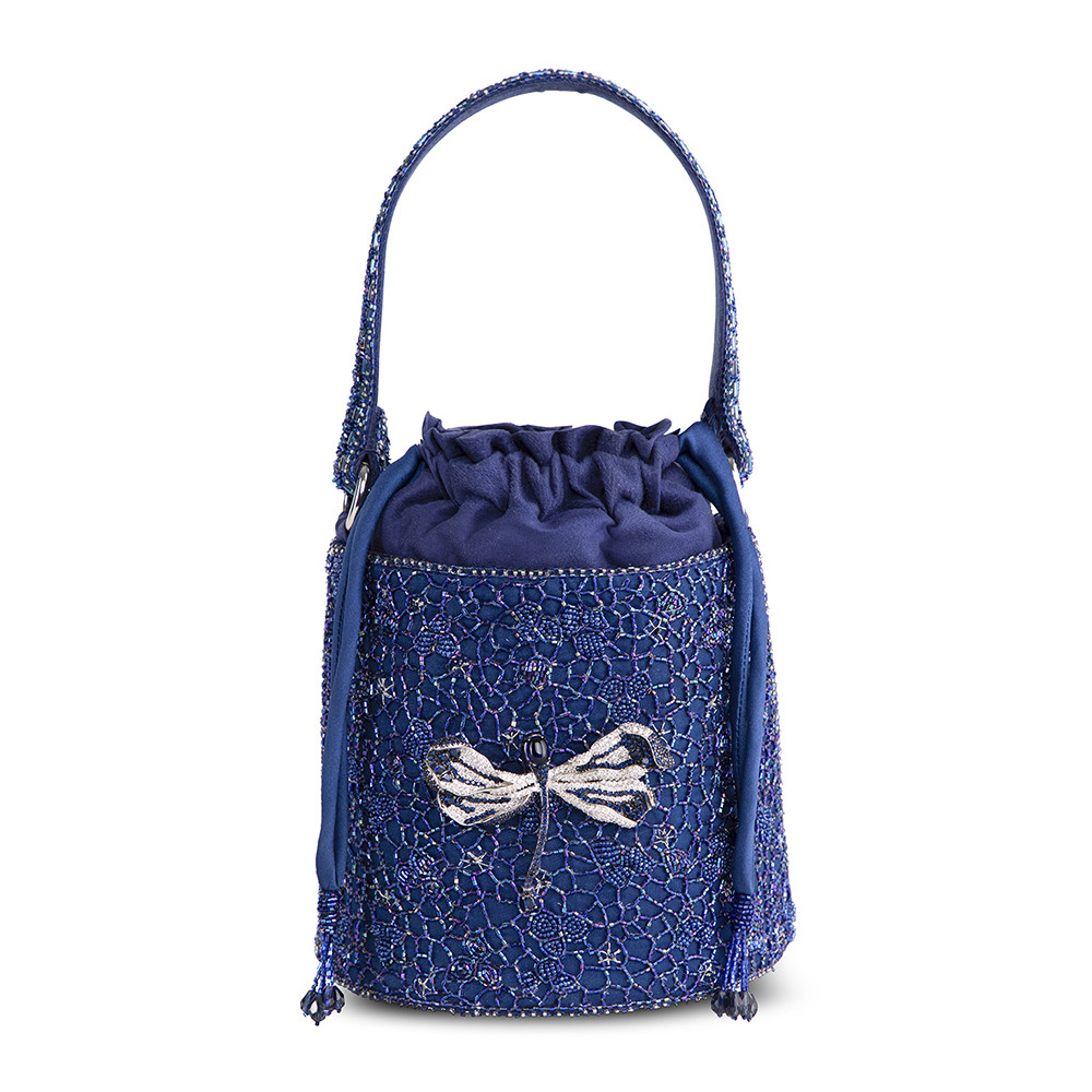 Inspired by nature’s intricate patterns, the Wazka Cylindrical Basket in Lapis Blue features a delicate dragonfly jewel crafted from semi-precious zircons and stones. The design mirrors the detailed patterns of dragonfly wings and leaf veins, bringing a refined touch to this unique round silhouette. Featuring a drawstring closure, embellished top handle, and a crossbody chain, this bag is perfect for carrying makeup, currency, cards, keys and a smartphone.