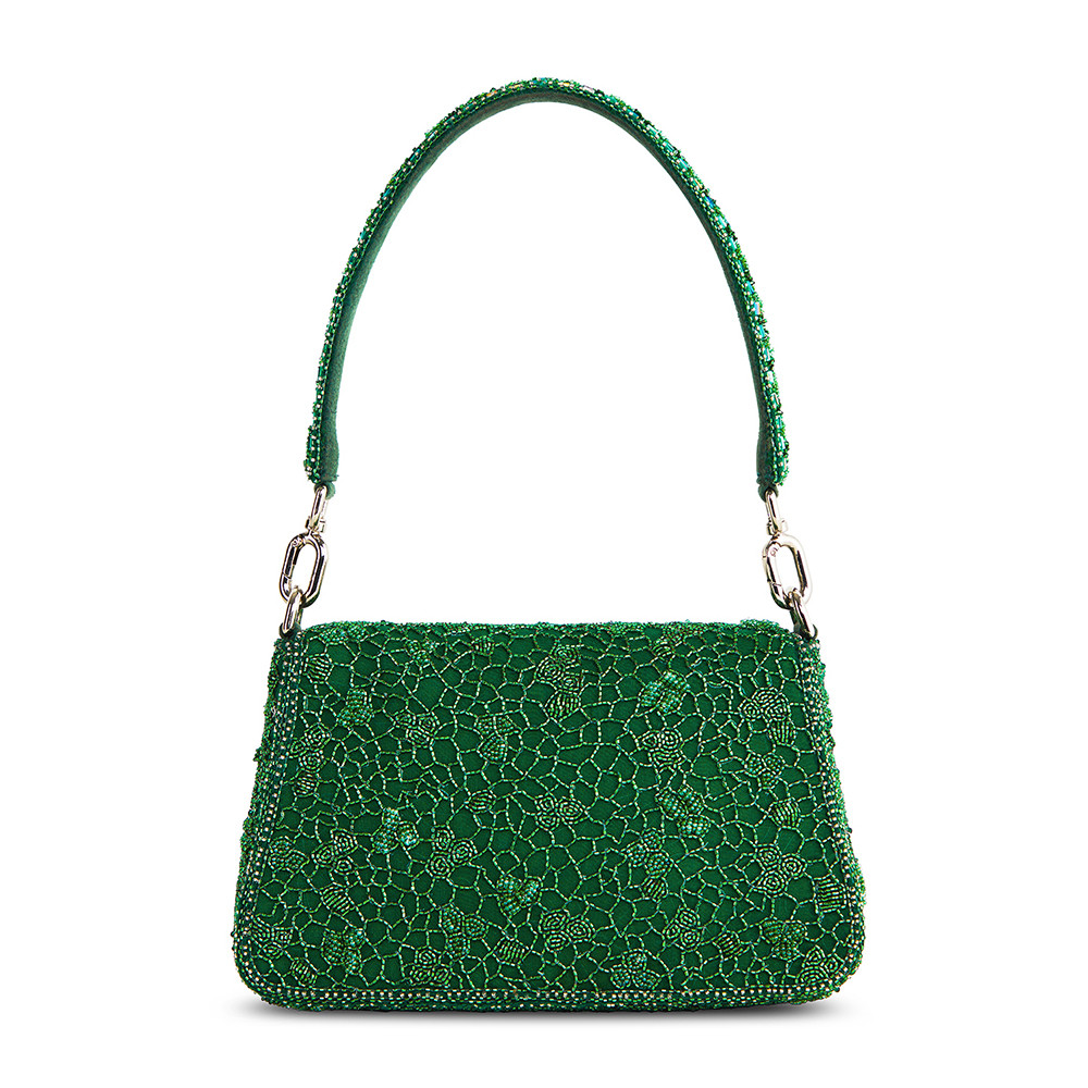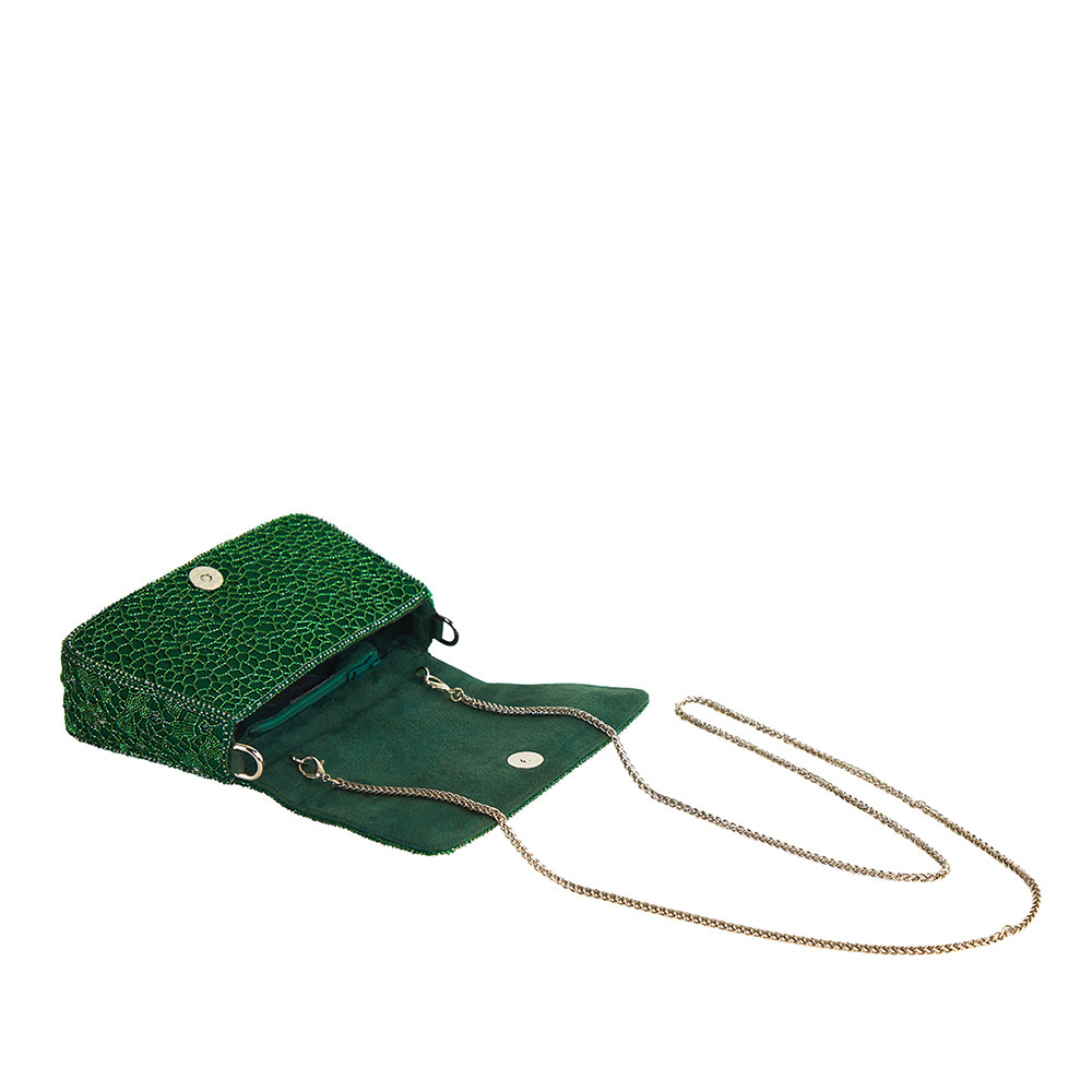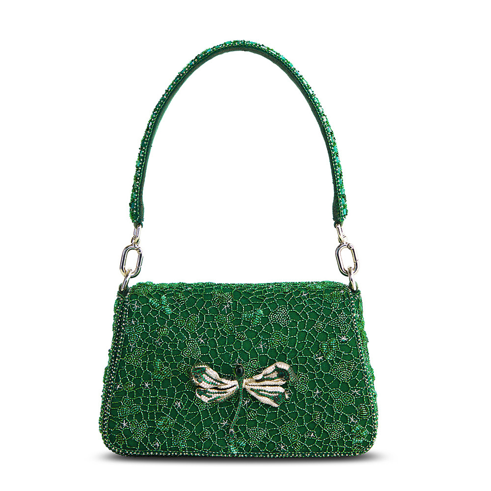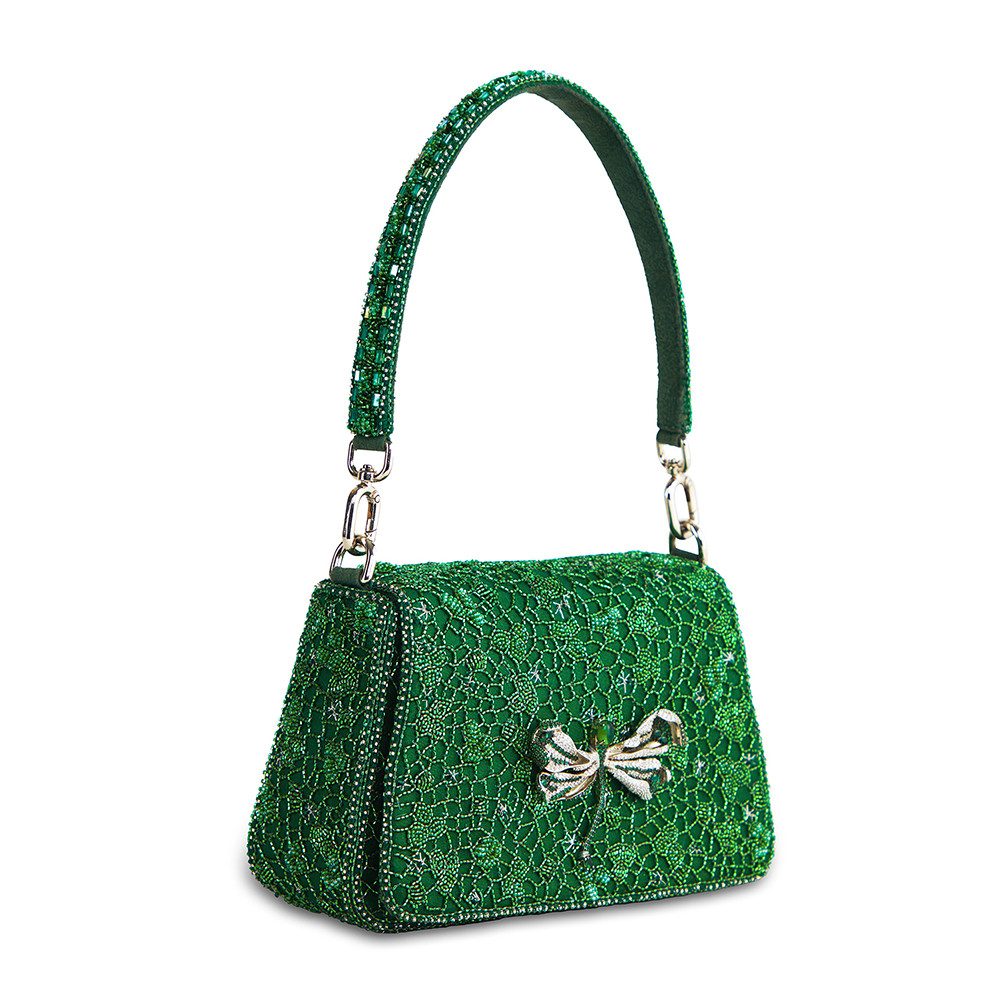 Inspired by nature’s intricate patterns, the Wazka Medium Trapezium in Emerald Green features a delicate dragonfly jewel crafted from semi-precious zircons and stones. Reflecting the intricate details of dragonfly wings and leaf veins, this design brings a touch of nature’s elegance to its structured silhouette. With a detachable embellished top handle and a crossbody chain, this bag is perfect for holding makeup, currency, cards, keys and a smartphone, and includes an inside slip pocket for easy organization.