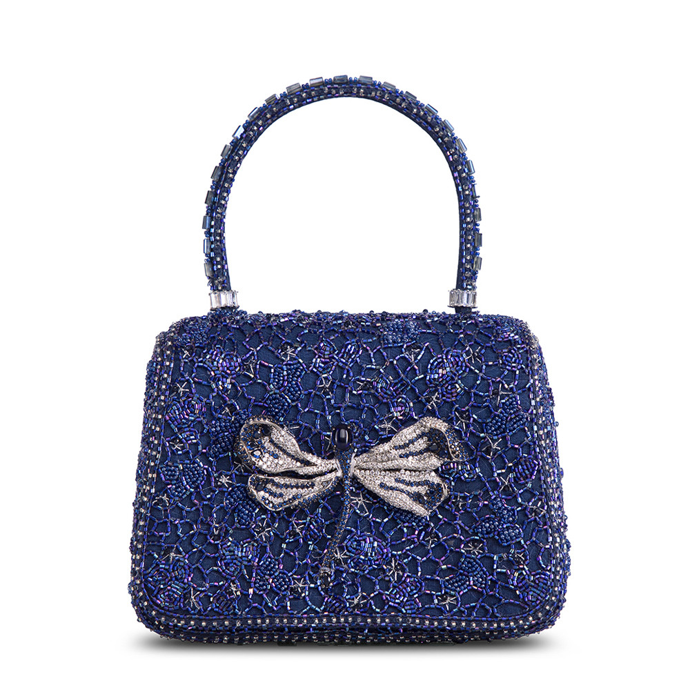 Inspired by nature’s intricate patterns, the Wazka Mini Trapezium in Lapis Blue features a delicate dragonfly jewel crafted from semi-precious zircons and stones. The design mirrors the detailed patterns of dragonfly wings and leaf veins, adding a refined touch to this compact silhouette. With an embellished top handle adorned with baguette encrusted rings and a crossbody chain, this mini bag is perfect for holding makeup, currency, cards and keys, and includes an inside slip pocket for easy organization.