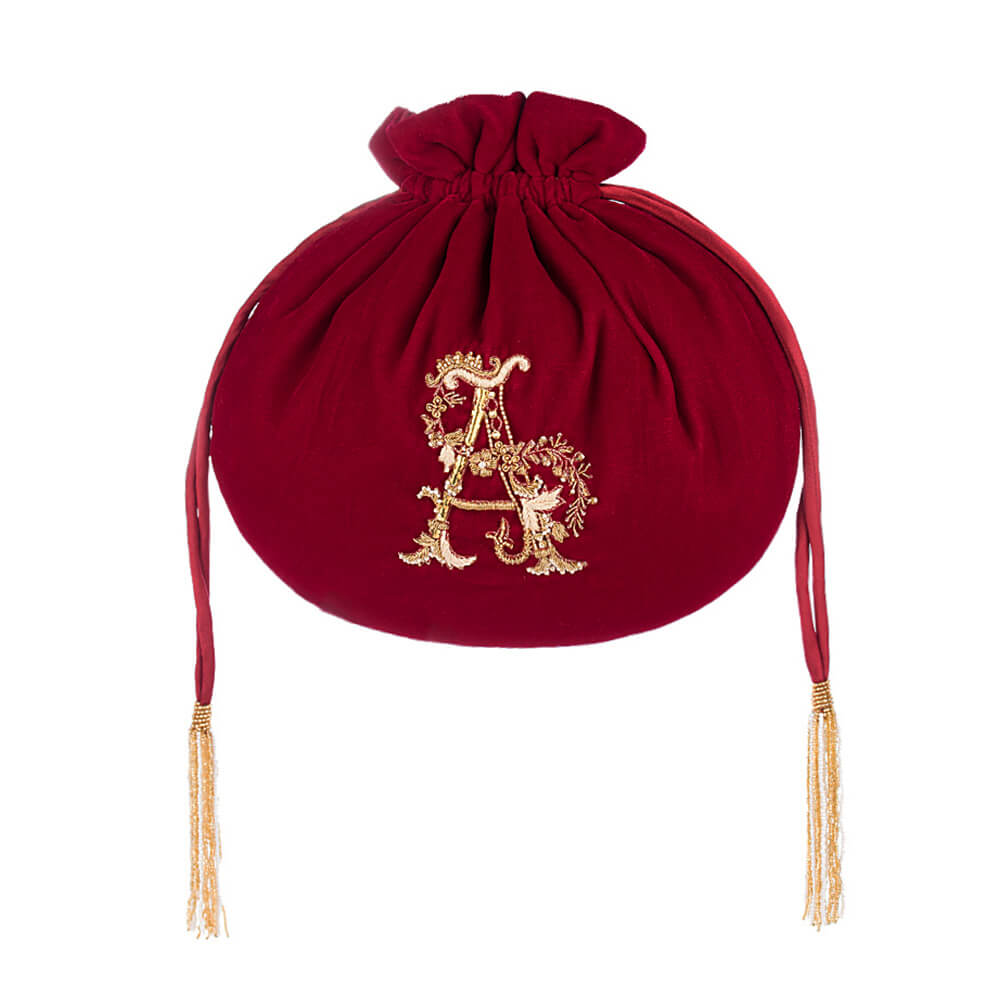 Dilara meaning beloved or one who decorates heart. Get this personalised caligraphy monogram potli pouch for that someone special or pamper yourself. It is hand embroidered with the desired initial in the finest zardosi using aged dabka, precious beads and silk floss thread.