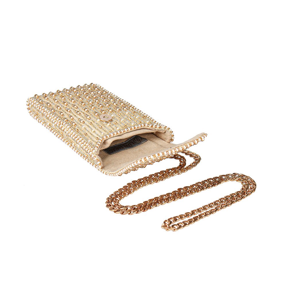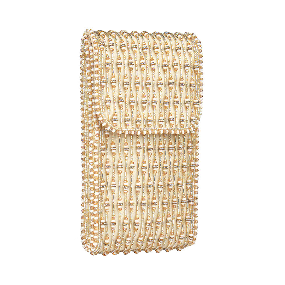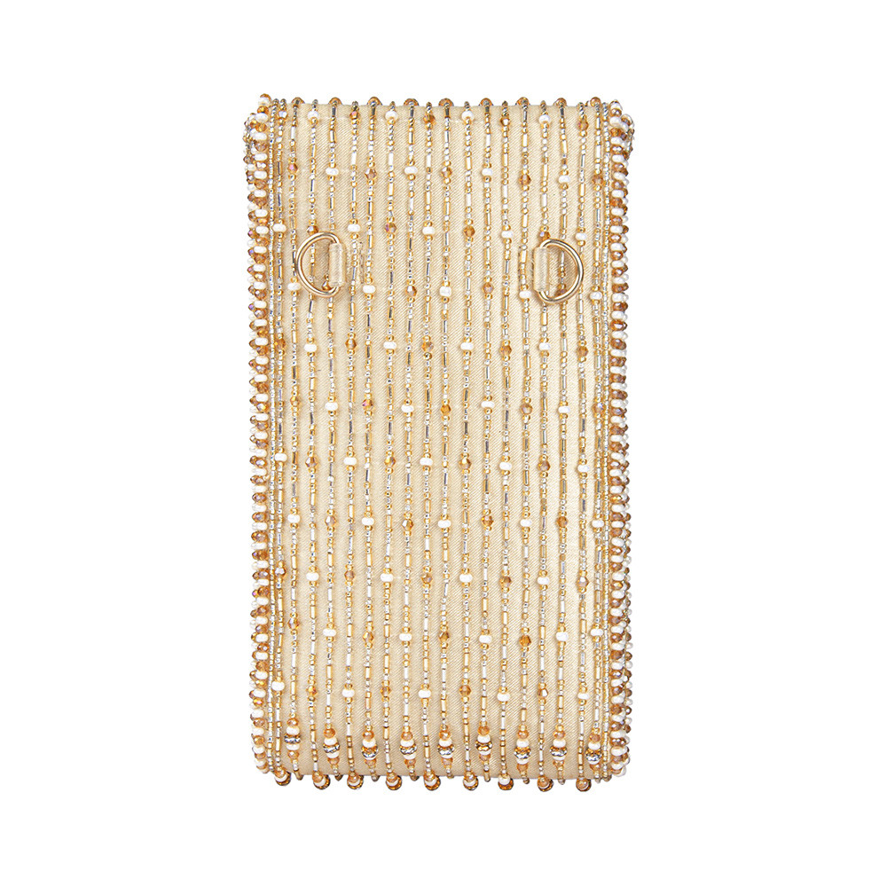 A lovetobag interpretation of the modern stripes, embroidered with lustrous Gold, Silver, Ivory Japanese beads and crystals The Zesha Mobile Pouch is a classic and elegant gold addition to you ensemble.